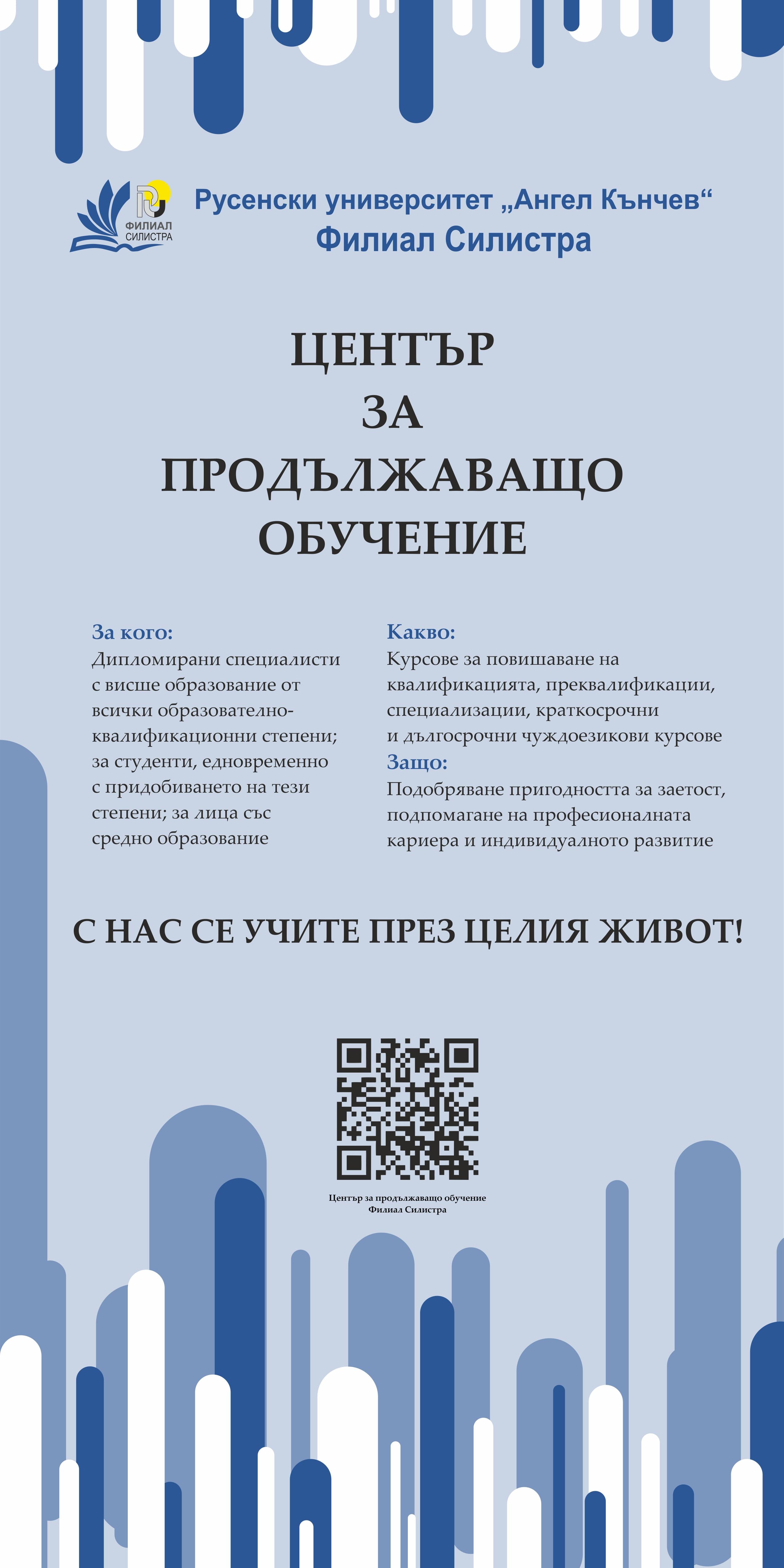 На 19 октомври към Центъра за продължаващо обучение при Филиал Силистра стартираха два курса: за следдипломна преквалификация за придобиване на професионална квалификация "учител по…" (по учебни предмети според професионалното направление от областта на висшето образование за завършили с образователно-квалификационна степен "бакалавър" или "магистър") и за следдипломна специализация за придобиване на професионална квалификация „учител по физическо възпитание и спорт” (за завършили висше образование с присъдена или придобита допълнителна професионална квалификация "учител" или „учител по…“). Специализантите бяха поздравени от директора на Филиал Силистра доц. д-р Румяна Лебедова с пожелание за успехи и висок спортсменски дух през цялата година.