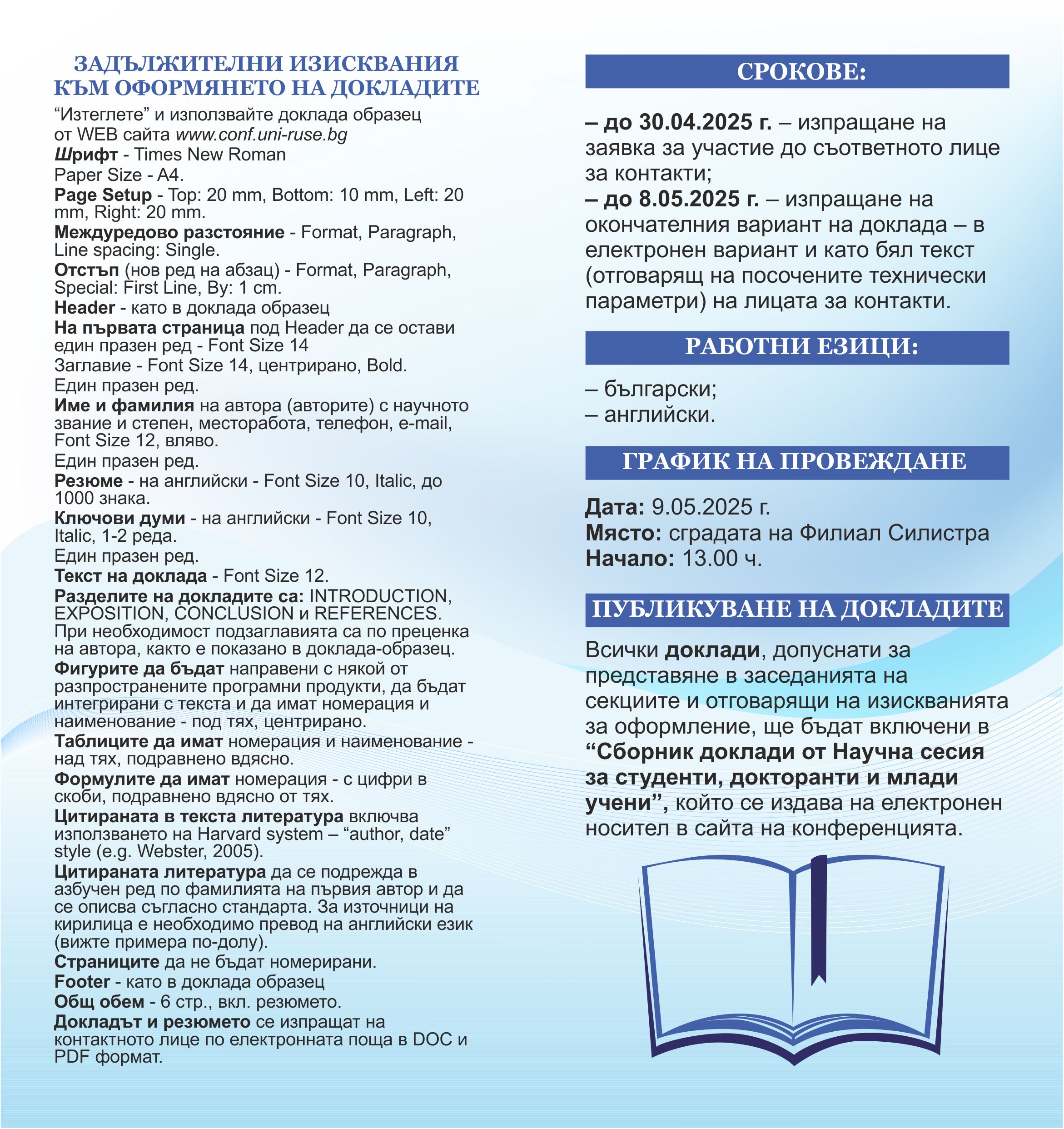 На 17.10.2025 г. Във Филиал Силистра на Русенския университет „Ангел Кънчев" се проведе ежегодната научна конференция с международно участие, в която се включиха 36 участници от ВТУ „Св. Св. Кирил и Методий"; Университета „Овидиус" (Констанца); Технически университет, Варна; Бургаски университет „Проф. А. Златаров"; Институт по етнология и фолклористика към БАН; Университет по химични технологии и металургия, София; Русенски университет „Ангел Кънчев" и др. На конференцията бяха представени 40 доклада в три секции в областта на хуманитаристиката, природните науки, педагогиката, методика на обучението по... ,информатиката, инженерните науки. Пленарни доклади представиха проф. д.т.н. Росен Иванов („Разход на енергия на транспортните средства") и доц. д-р Константин Коев (Съвременни предизвикателства при системи с възобновяеми източници на енергия").