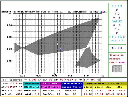 - При известни m, Z1 , Z2 , β, параметри на режещия инструмент, автоматизирано се построяват геометрични блокиращи контури (ГБК) от вида „х – aw".