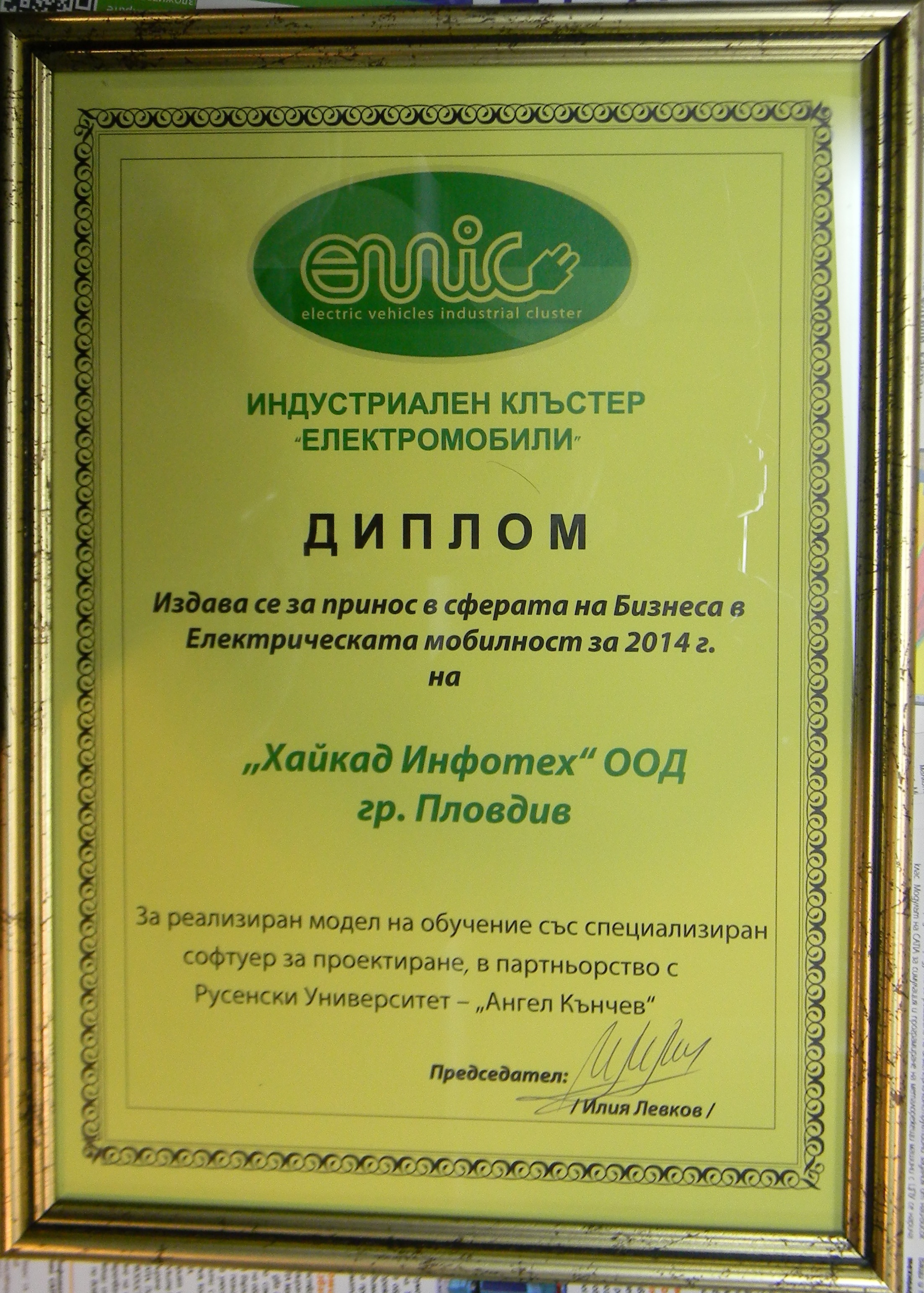На 13.03.2015 г. Фирма Хайкад Инфотех в рамките на участието си на предстоящото специализирано изложение за машини, технологии и индустриално оборудване MachTech&InnoTech в сградата на Интер Експо Център - София , покани колективи от Русенски университет „Ангел Кънчев”. Фирмата бе номинирана за принос в сферата на бизнеса в Електрическата мобилност за 2014 г. Престижната награда се присъжда от Индустриален клъстер „Електромобили“, а номинацията е за реализиран модел на партньорство на Хайкад Инфотех с Русенски университет „Ангел Кънчев”. (повече информация: http://www.инженер.bg/sofia/events-machtechinnotech)