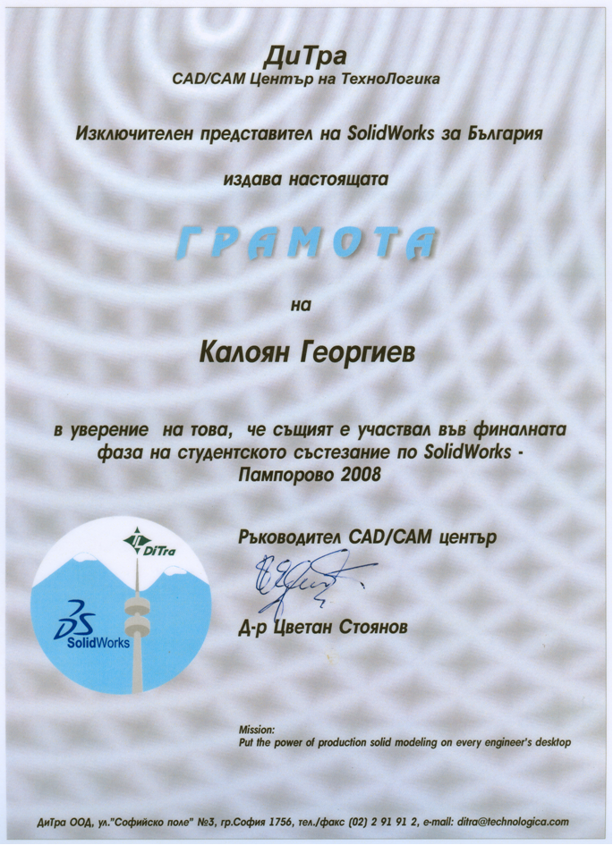 | Разработване на 3-Д модели на калкулатор | 2008 | 3263,85 | 2 | 4 | „Оргтехника" АД-Силистра |