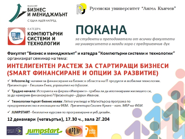 Представени бяха възможностите за финансова подкрепа и експертна помощ за предприемчиви хора с визия за развитие, предоставяни от национален клуб по предприемачество „Start it Smart“, както възможностите, които катедра „Мениджмънт и бизнес развитие“ на ФБМ предлага за придобиване на ключови предприемачестки умения и компетенции в рамките на магистърска програма „Предприемачество и иновации“ – един образователене продукт, разработен по холандски модел от русенските преподаватели, специализирали по методики на Харвард, Кеймбридж и Оксфорд в Европа. Специални гости на събитието бяха представители на софтуерна компания Микроинвест, които презентираха възможностите за работа със специализирани системи за управление на бизнес процеси в областта на CRM (Customer Relations Management) и ERP (Enterprise Resource Planning).