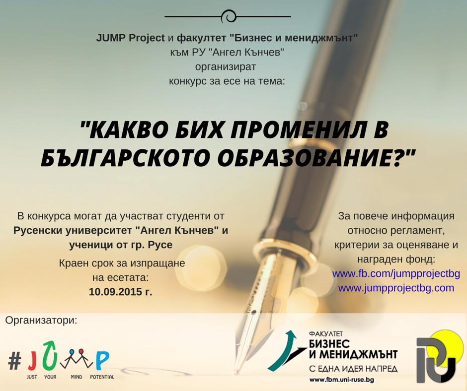 Екип на факултет „Бизнес и мениджмънт“ на РУ “Ангел Кунчев“ по проект EduLab4Future – ще проведе мултипликационно събитие на тема: Повишаване на образованието за отговорно управление чрез иновативни учебни програми за гражданство и устойчиво развитие на бизнеса. Събитието е финансирано по програма Еразъм + на Европейската комисия, приоритетна ос КА2, като водеща организация е университет Политехника – Букурещ, а партньори: UNIVERSITY OF LODZ (Полша); Brno University of Technology (Чехия) и центровете за професионално обучение - INFOR ELEA (Италия) и EUROTRAINING SOLUTION (Румъния). Цялата новина.