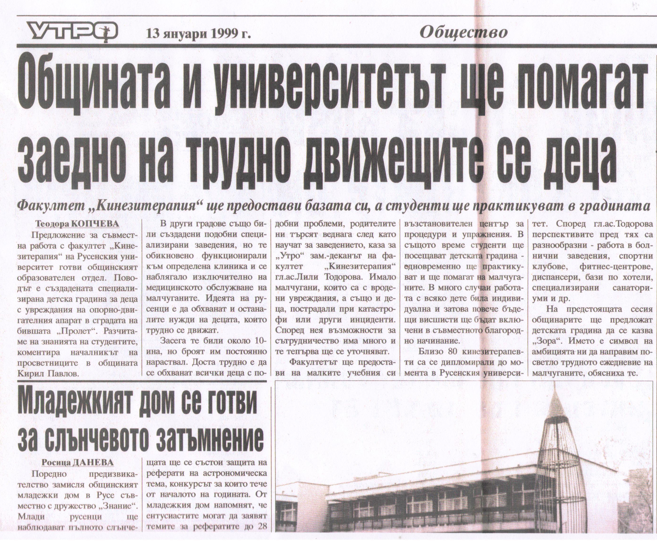 Вестник "Утро" 13.01.1999 - "Общината и университетът ще помагат заедно на трудно движещите се деца"