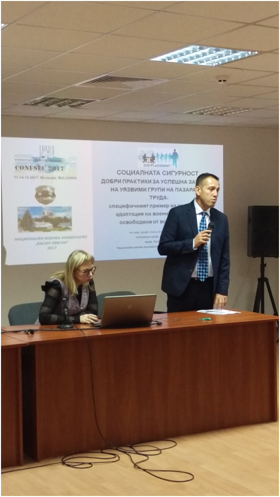 Докладът разглежда специфичната тема на процесите на социална адаптация на освободените от Българската армия военнослужещи и на техните семейства, както и подходите и технологията на прилагане на различни модели за осъществяване на този процес. Бяха представени резултатите от няколкогодишни изследвания на екип от български учени в тази посока
