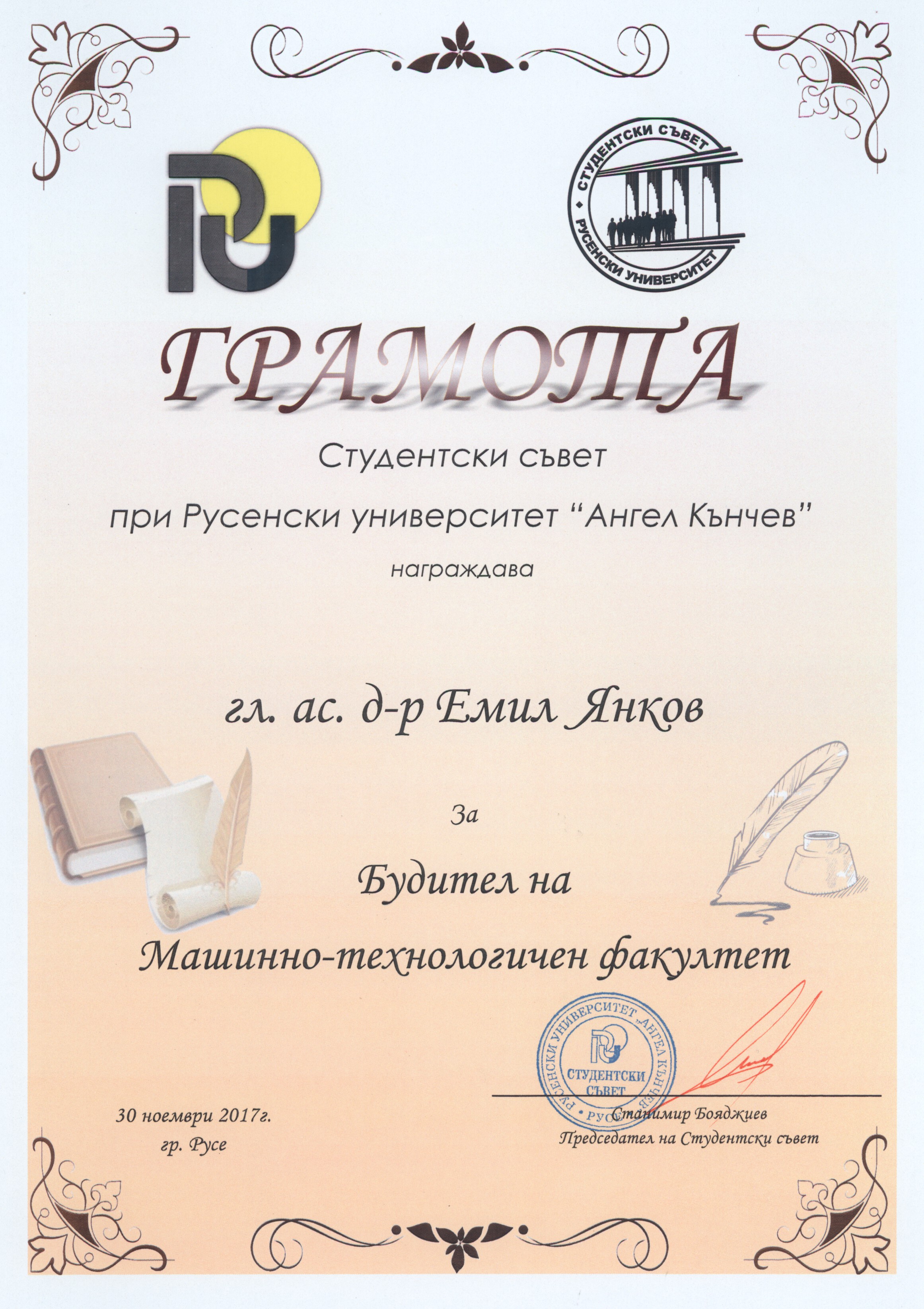 На тържествено събрание по повод Деня на Русенския университет „А. Кънчев" - 12 ноември, бяха връчени дипломите на защитилите образователно-научна степен „доктор" колеги д-р инж. Данаил Николов и д-р инж. Николай Малчев, както и на придобилите академичната длъжност „доцент" колеги доц. д-р инж. Мария Николова от катедра МТМ и доц. д-р инж. Димитър Димитров от катедра ТММРМ.