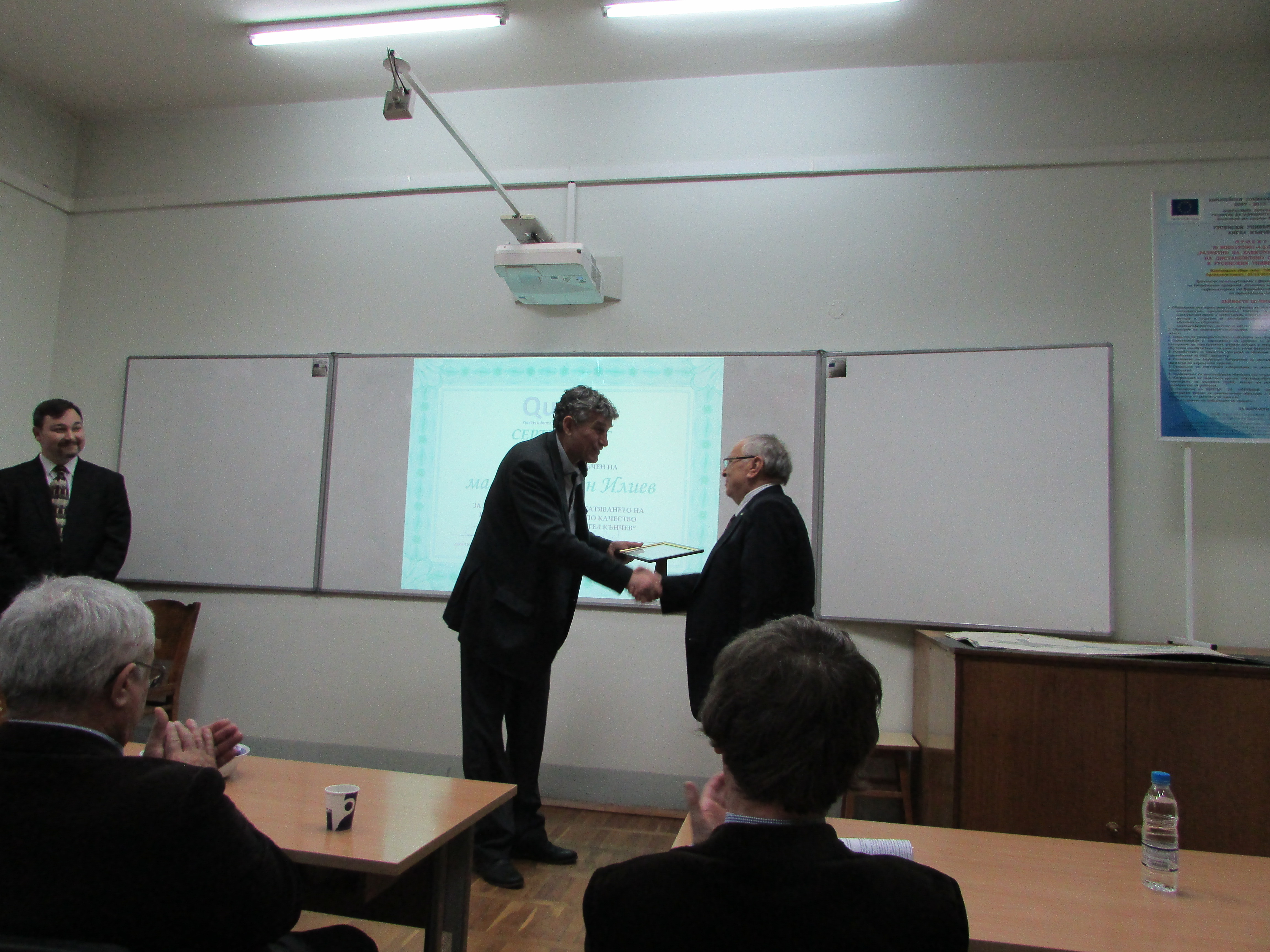 Доц. д-р инж. Иван Михайлов бе отличен от Ректора със златна значка на Русенския университет за приносите му в дългогодишната учебна и научно-изследователска дейност, както и по повод 85 годишнината му.