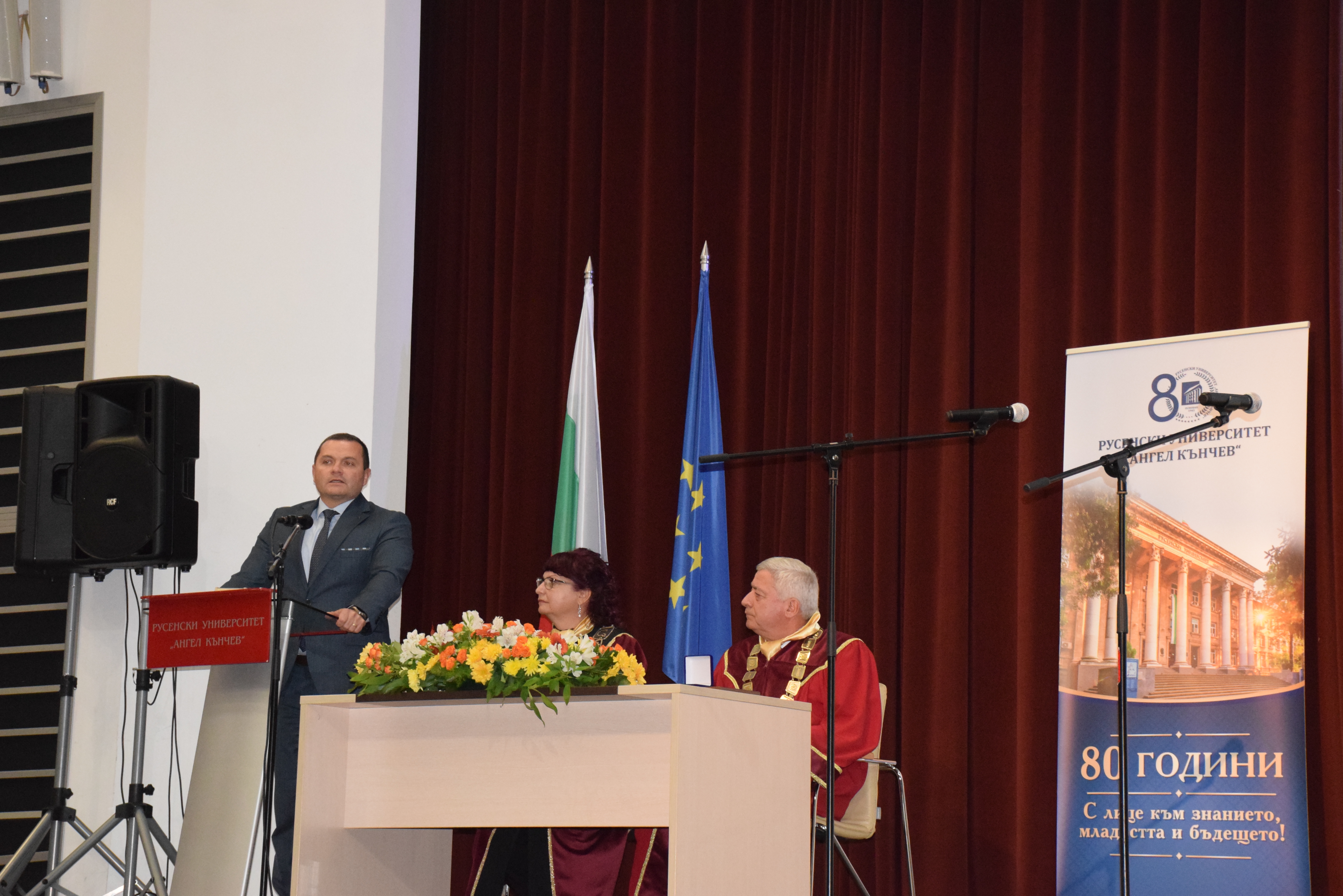 On behalf of the management and academic community of the higher education institution, the ceremony was also attended by: the Chairman of the General Assembly and Honourary Rector of the University of Ruse, Academician Hristo Beloev, DscEng, the Vice-Rector for Academic Affairs, Professor Teodor Iliev, PhD , the Vice-Rector for International Cooperation, Associate Professor Galina Ivanova, PhD and the Vice-Rector for Research Professor, Daniel Bratanov, PhD, deans of faculties, members of the Academic Council and students.