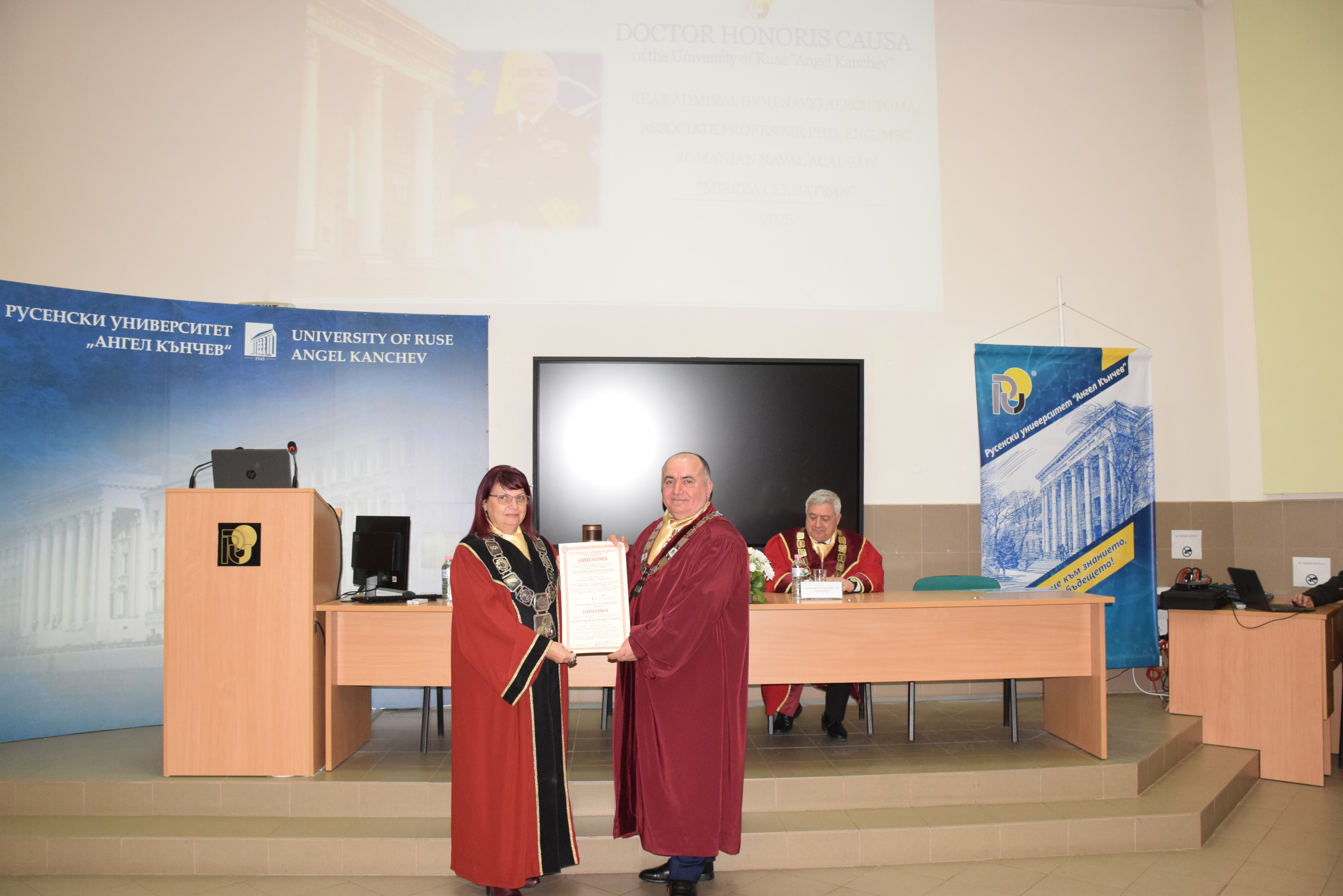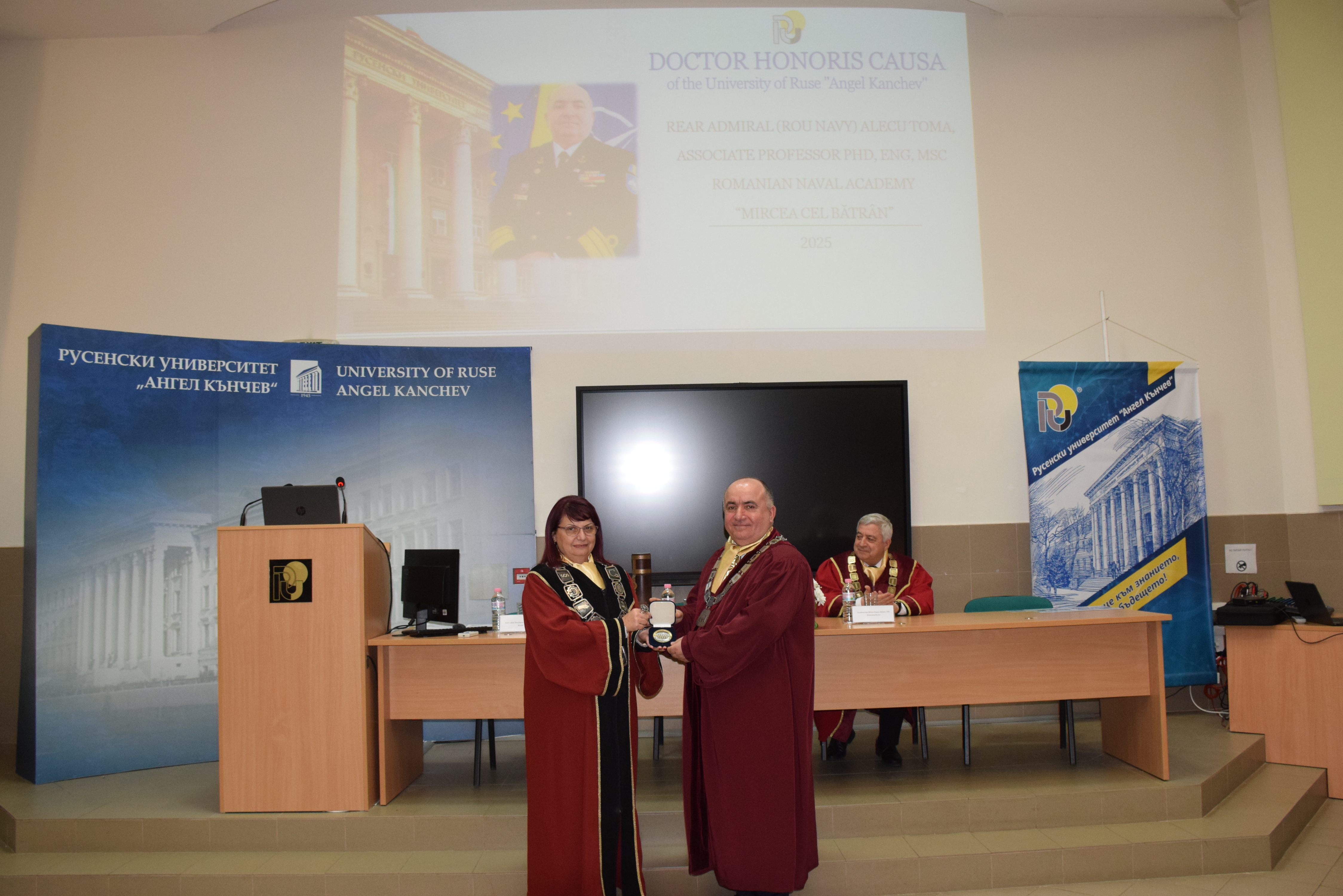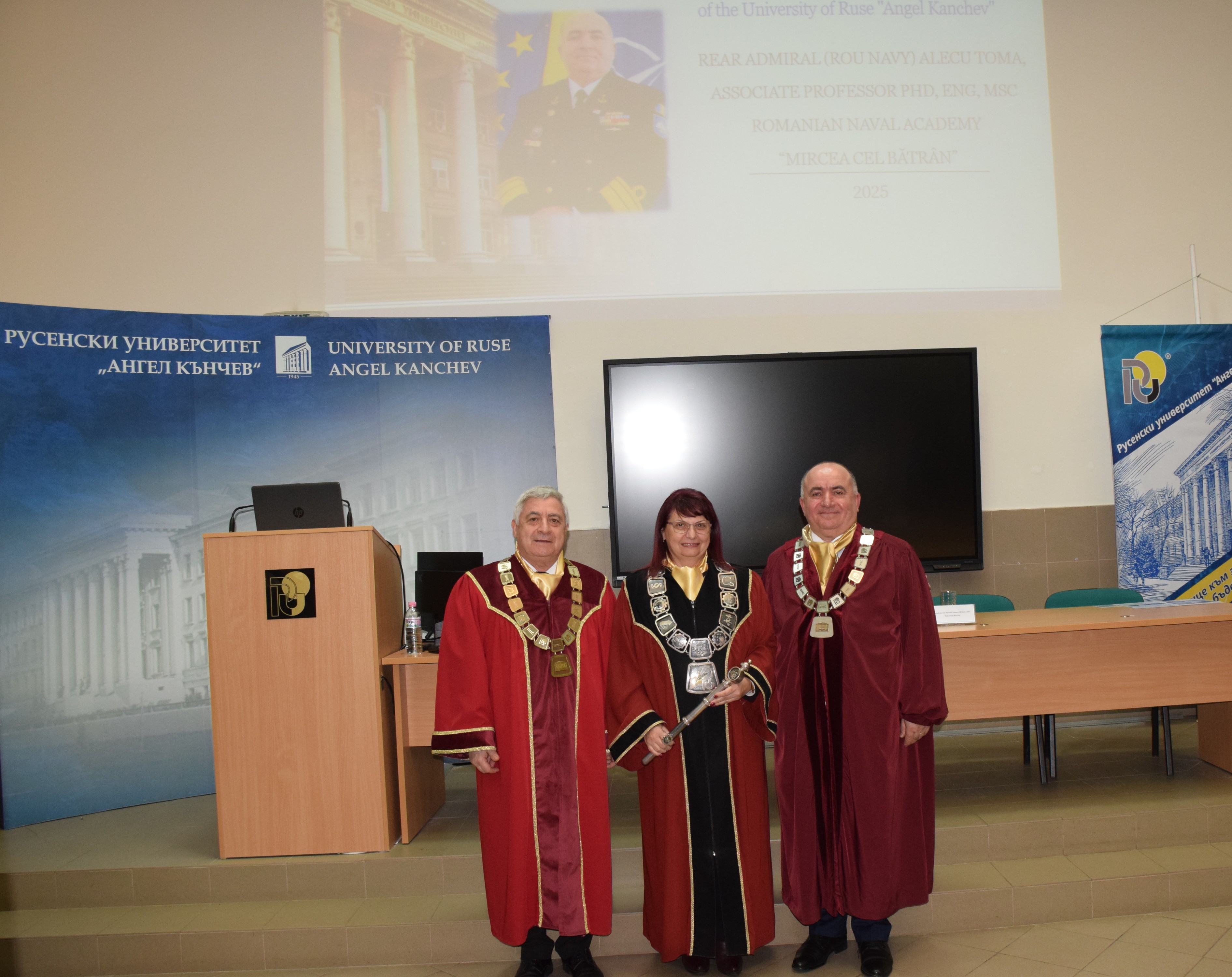 Today, 18th March, 2025, in hall 2.101 of the University of Ruse, the solemn ceremony of awarding the honorary title Doctor Honoris Causa of the University of Ruse "Angel Kanchev" to Rear Admiral Alecu Toma, Rector of the Naval Academy "Mircea cel Bătrân" - Constance, Romania was held.