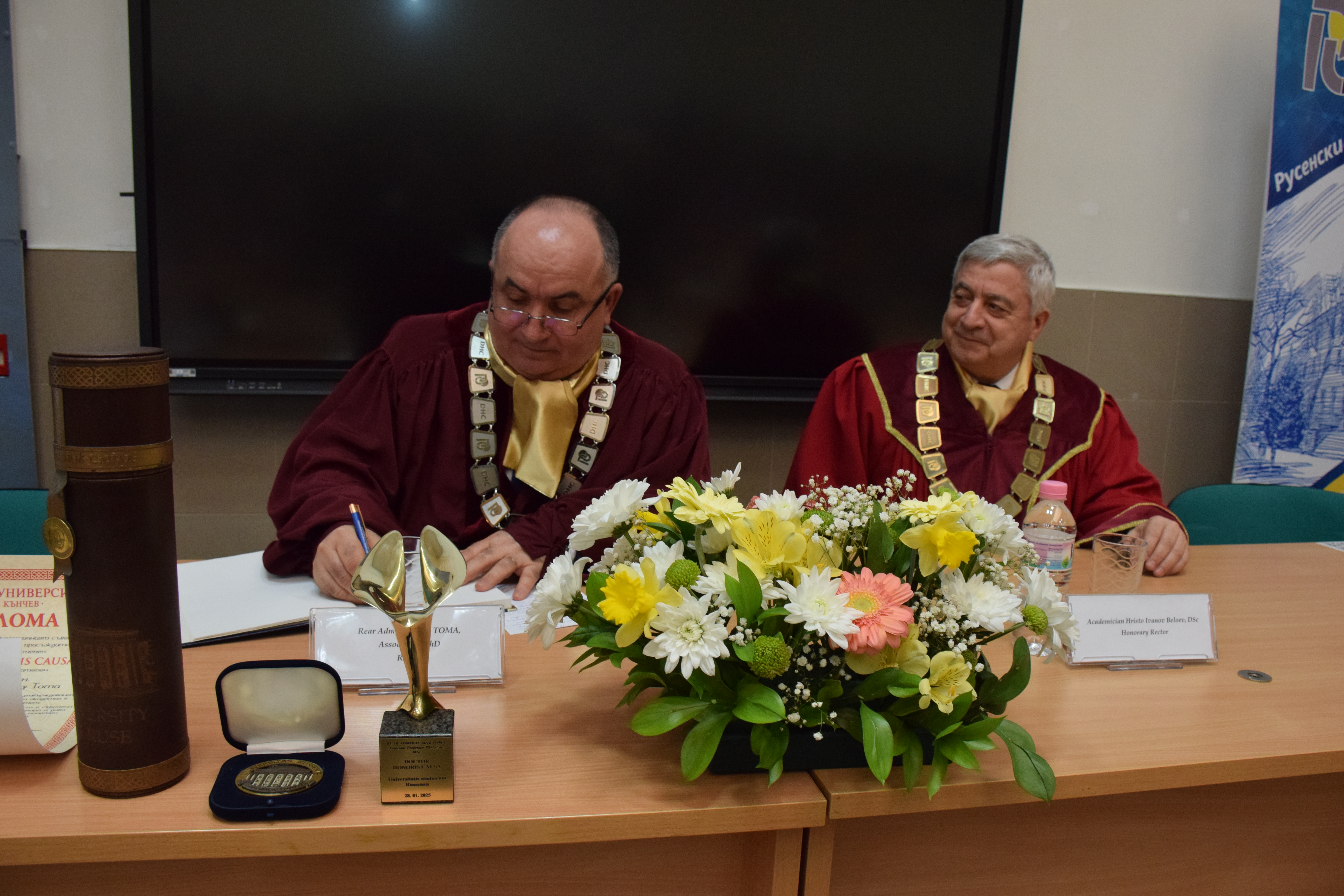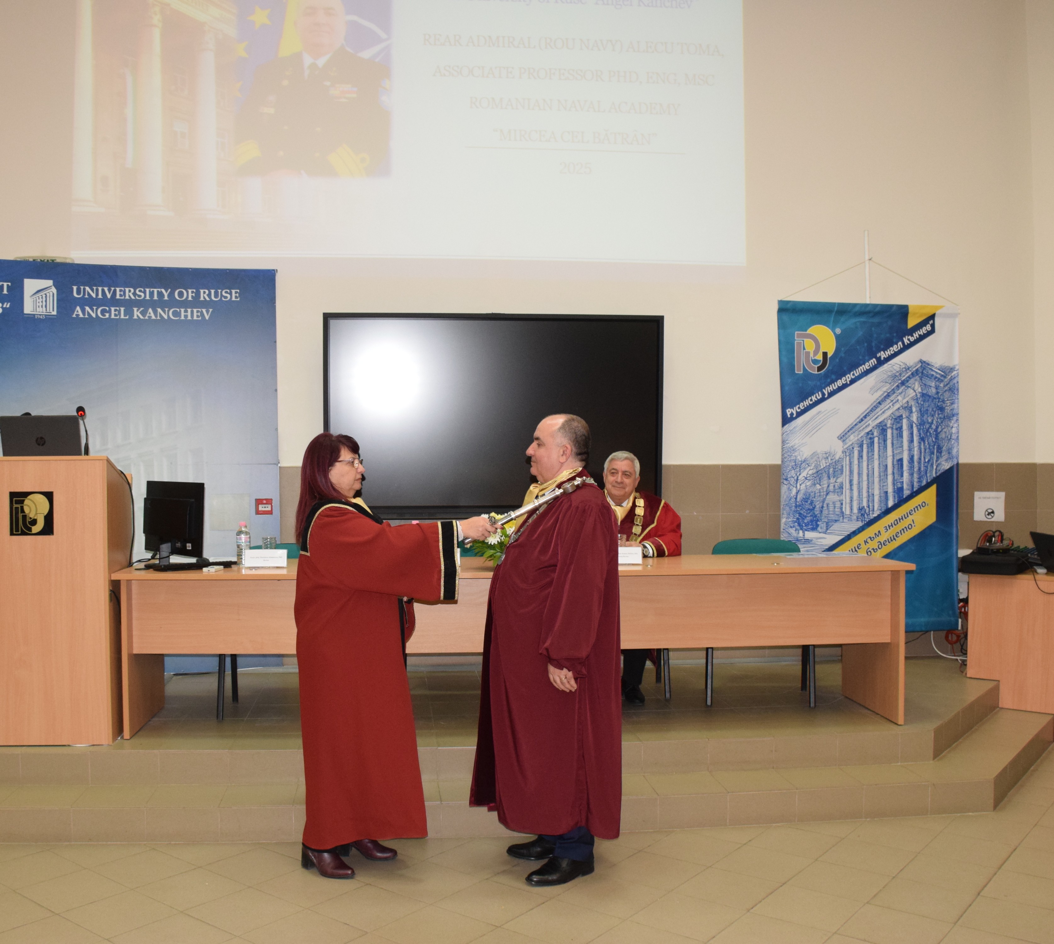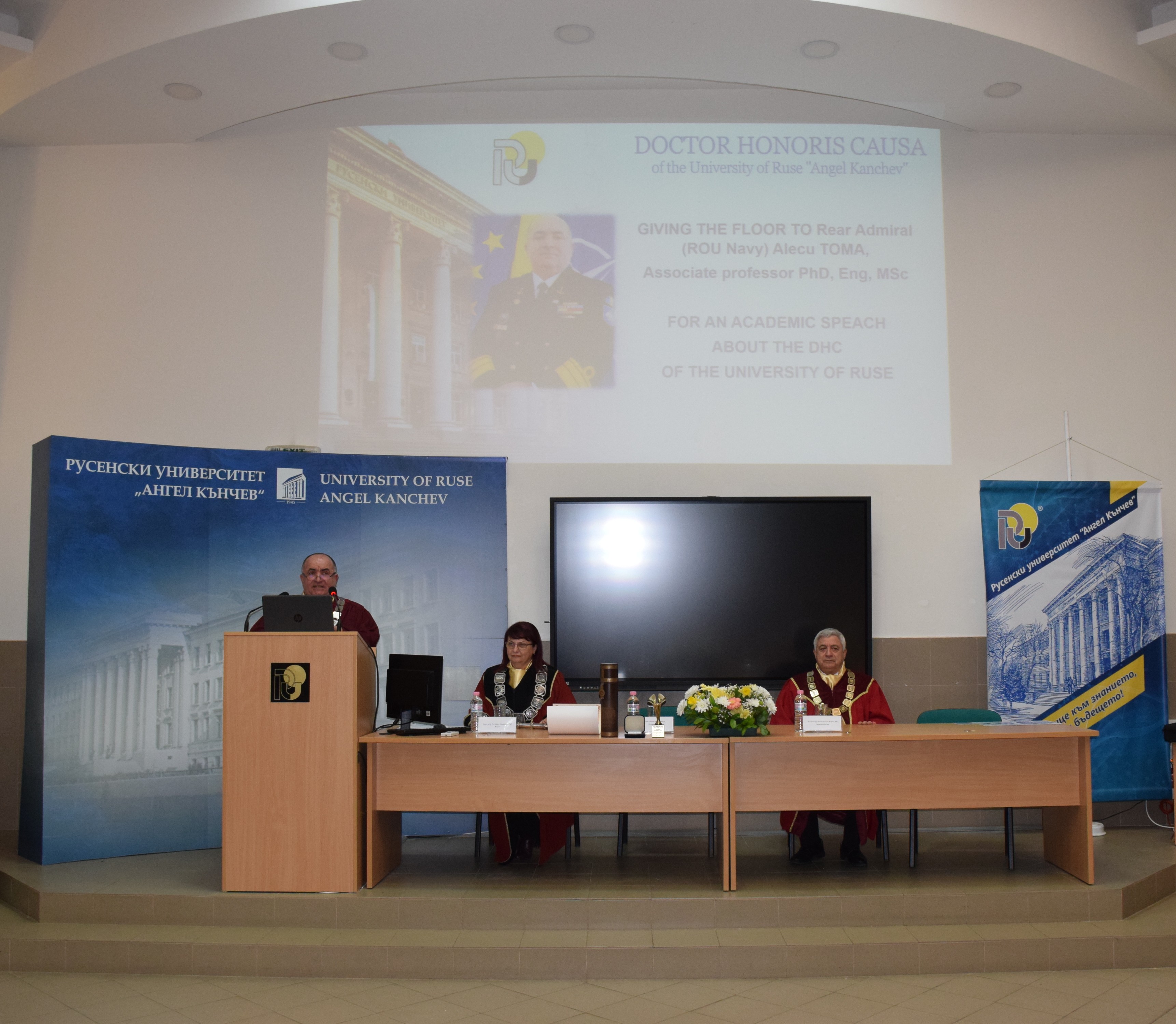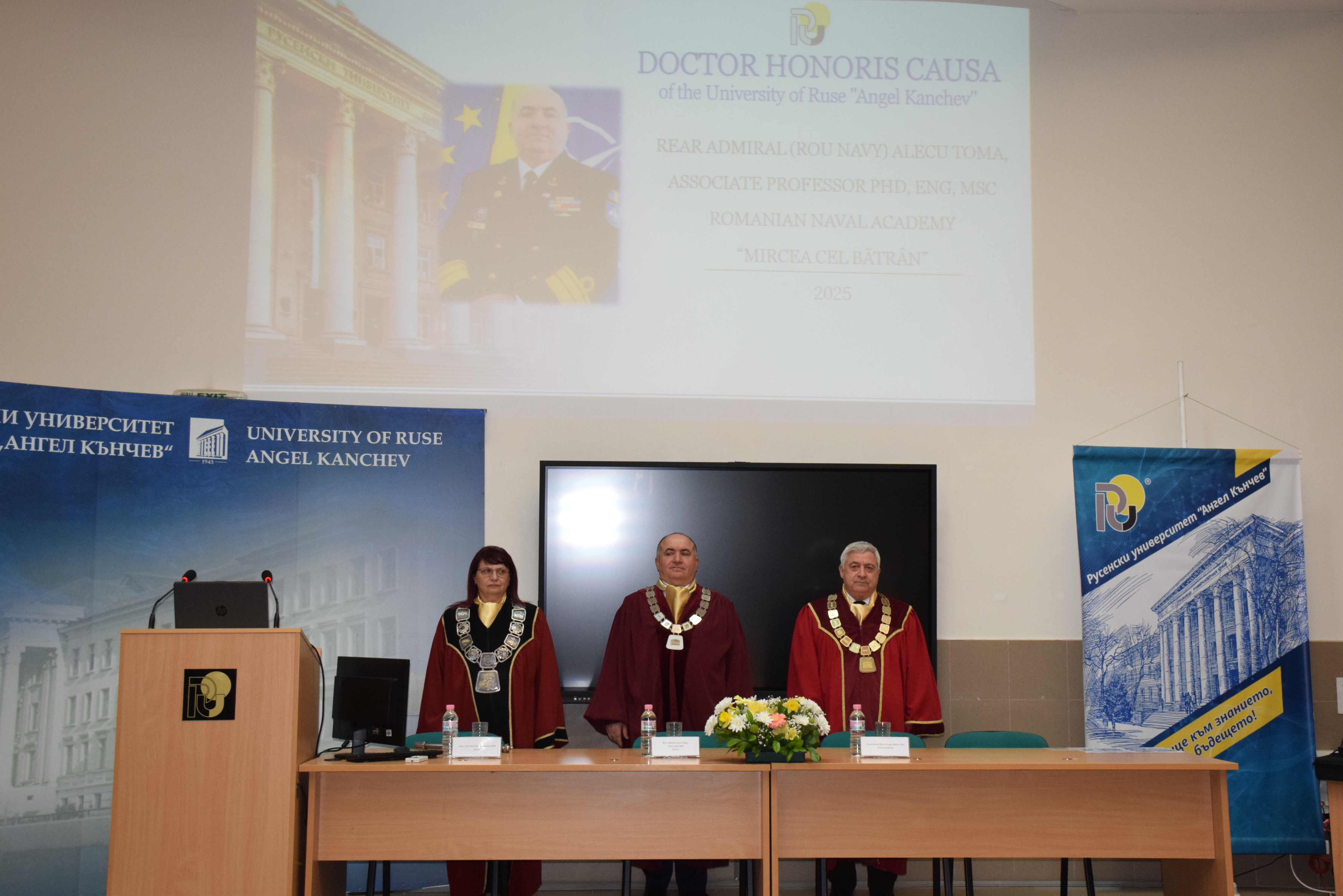 Today, 18th March, 2025, in hall 2.101 of the University of Ruse, the solemn ceremony of awarding the honorary title Doctor Honoris Causa of the University of Ruse "Angel Kanchev" to Rear Admiral Alecu Toma, Rector of the Naval Academy "Mircea cel Bătrân" - Constance, Romania was held.