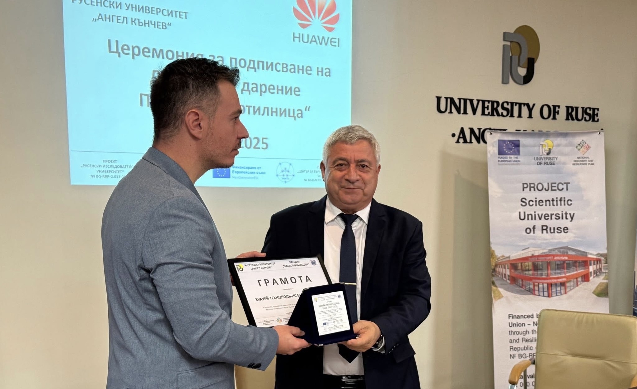 On November 12th , 2025, a meeting was held between the management of the University of Ruse and Huawei Technologies Bulgaria EOOD. The meeting was attended by the rector of Assoc. Prof. Desislava Atanasova, PhD and academician Hristo Beloev, DscEng - honourary rector and chairman of the General Assembly of the University of Ruse. and the technology giant was represented by Mr. Li Zemin, General Manager of the company for Bulgaria, Mr. Chris Hu, Director of the Corporate Clients Division, Mr. Ruslan Tsankov, Key Account Manager and Ms. Raya Guncheva, Public Relations Manager.