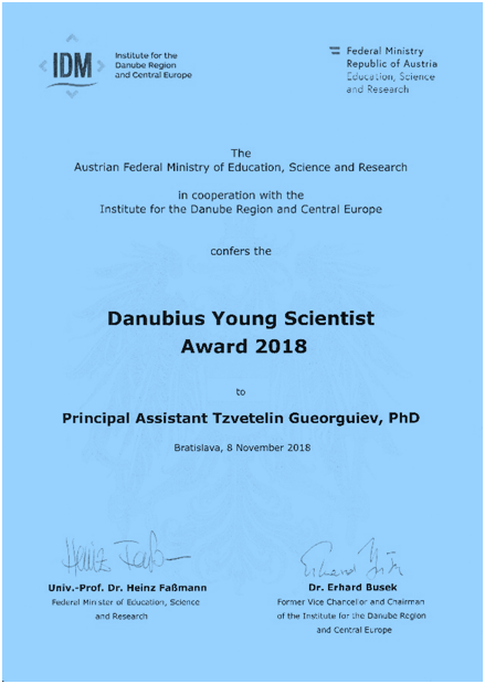 На 8 ноември 2018 год. на официална церемония в Университета „Комениус" в Братислава, гл. ас. д-р Цветелин Георгиев получи наградата за млад учен Danubius Young Scientist Award (DYSA).