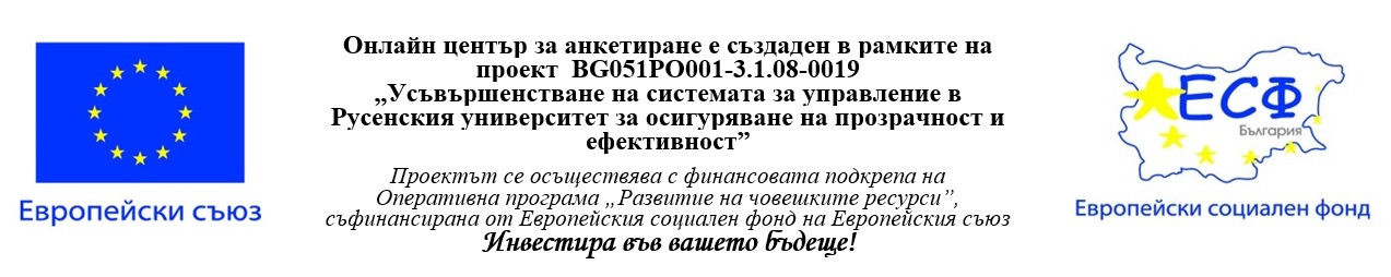 Уважаеми посетители на онлайн центъра за анкетиране на Русенски университет „Ангел Кънчев“, Ръководството на университета работи постоянно за развитие и подобряване на своята дейност. За да се получава текущо по-обективна и полезна информация беше разработена системата за анкетиране, която обхваща различни заинтересовани страни.